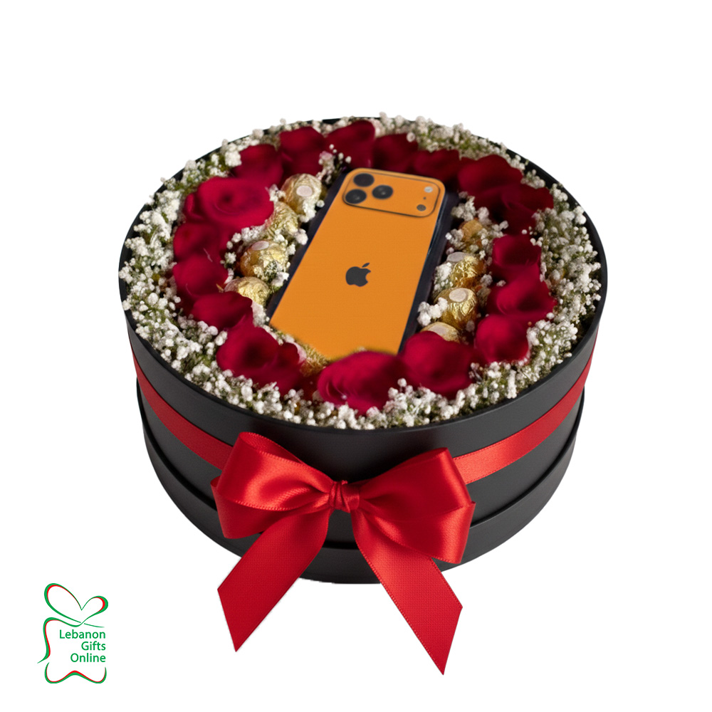 A luxurious gift set featuring the latest iPhone 17 paired with a stunning bouquet of fresh red roses, ideal for tech lovers and special occasions