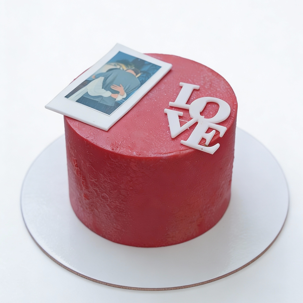red round cake with photo on the right and love the left filled with red velvet that serve arround 8 persons